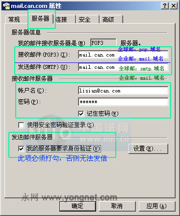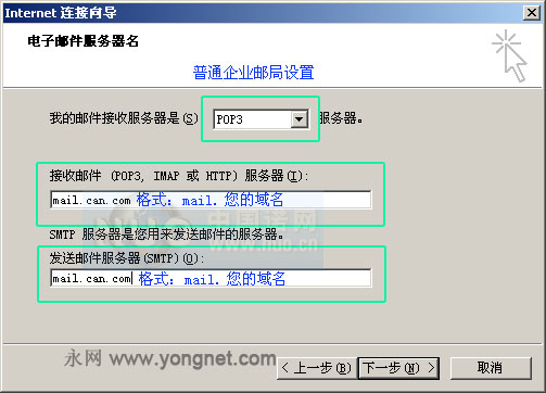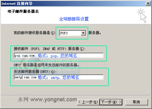第五步:設(shè)置POP3以及SMTP服務(wù)器地址(普通郵局請參考圖一,全球郵請參考圖二)