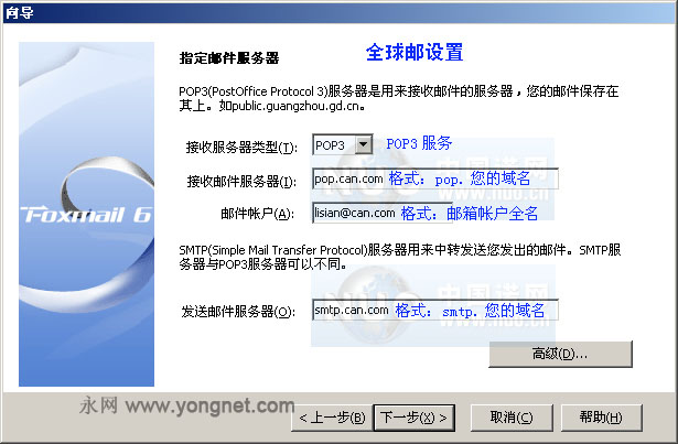 第三步:設(shè)置郵件服務(wù)器信息,包括服務(wù)類型、pop3地址、smtp地址、驗證帳號。分為“普通企業(yè)郵局”及“全球郵”兩種。接著點(diǎn)擊“下一步”完成設(shè)置。
