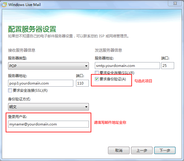 发送服务器信息:服务器地址填入:smtp.您的域名;端口默认为“25”;要求身份验证需勾选;